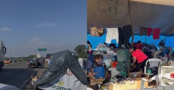 Uma das pessoas que está acampando nas rodovias é Sandra, que ajuda a receber doações e as destina para quem precisa.