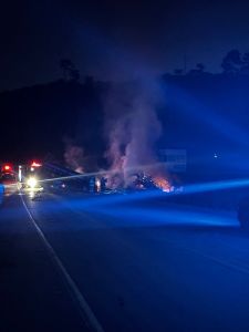 As primeiras informações são que se trata de uma colisão entre carro, ônibus com passageiros e caminhão. O ônibus pegou fogo após o acidente.