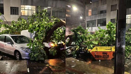 Árvore cai durante chuva forte e danifica 5 carros na Savassi, em BH; veja imagens