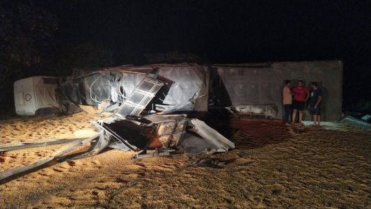 BR-262: carreta com toneladas de milho tomba e deixa feridos no retorno do feriadão