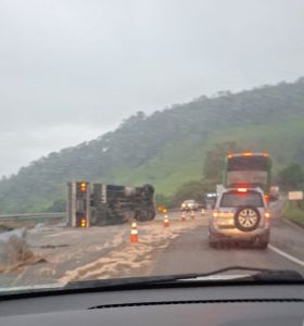 BR-381: carreta com chapas de aço tomba e fecha pista da rodovia em MG