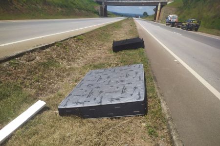 Cama cai de caminhonete transportada por reboque e causa acidente na BR-262, em MG