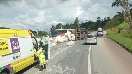 Uma pista da rodovia está parcialmente bloqueada no sentido Belo Horizonte (MG) devido ao tombamento