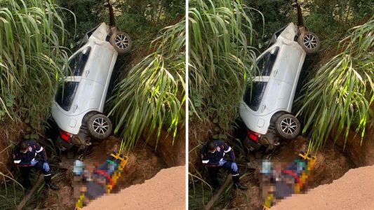 Carro capota e cai dentro de buraco na MG-040 em Brumadinho, na Grande BH