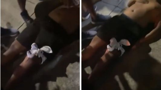 Um vídeo compartilhado nas redes sociais mostra o adolescente de 16 anos deitado no chão, com uma atadura para estancar o sangramento na perna, aguardando o resgate.