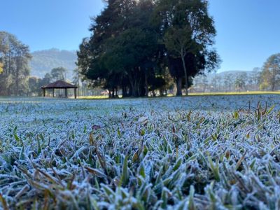 Registro de geada no Parque Municipal de Caldas (MG) em 2023 • Prefeitura de Caldas
