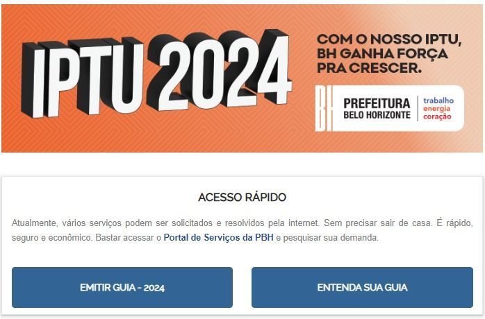 As guias do IPTU/2024 são enviadas pelos Correios e também podem ser acessadas on-line em www.pbh.gov.br/iptu ou pelo aplicativo PBH (disponível em IOS e Android). Também podem ser obtidas em agências dos Correios, mediante taxa de administração.