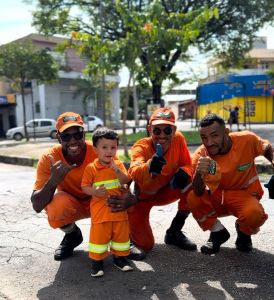 O pequeno Benício vestiu o uniforme da SLU e 'foi ao trabalho' com os profissionais da limpeza da capital mineira