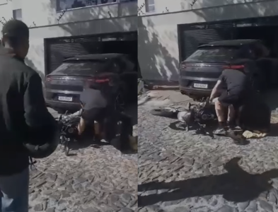 Um circuito de segurança vizinho mostra que o entregador parou o veículo em frente à garagem de um prédio. O motorista da Porsche, em seguida, abre o portão, mas não consegue sair. Ele, então, encosta o carro no veículo do entregador, desce do carro e derruba a moto.