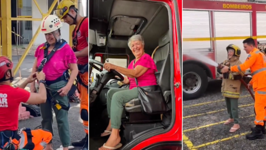 Vídeo: aos 80 anos, idosa realiza o sonho de ser bombeira por um dia em BH