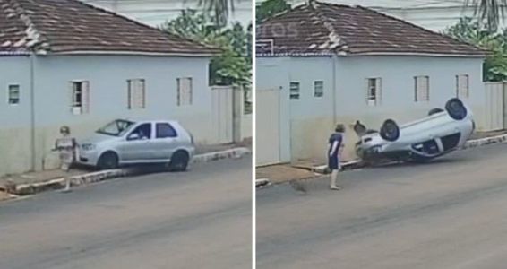 Vídeo: carro capota e quase atinge mulher que passeava com cachorro em Luz (MG)