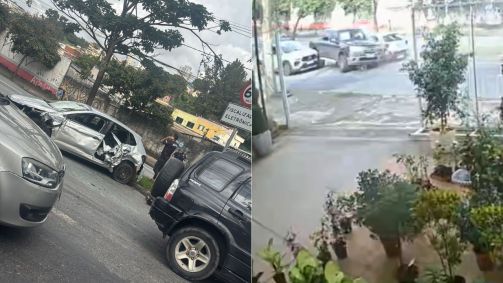 Um vídeo de câmera de segurança registrou o momento em que três carros se envolveram em um acidente na Avenida Carlos Luz, no bairro Caiçaras, na Região Noroeste de Belo Horizonte, na manhã desta quarta-feira (18).
