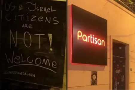 Na porta do estabelecimento havia uma placa com uma mensagem em inglês, riscada em giz, que restringe o acesso de determinados grupos. “US e Israel citizens are NOT welcome”, alerta o restaurante. Em tradução livre, a placa diz que “Cidadãos dos EUA e de Israel NÃO são bem-vindos”.