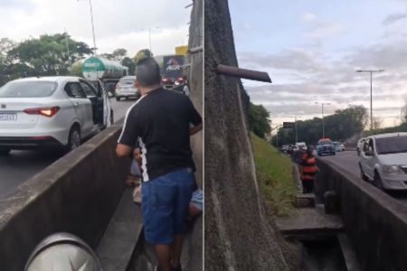 Durante o tiroteio, motoristas que passavam pela via expressa se protegeram atrás da mureta para escapar dos disparos.