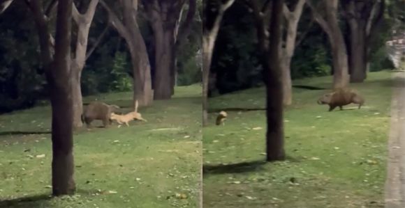 As imagens mostram o cãozinho Marley correndo atrás da capivara entre as árvores e no meio do calçadão.