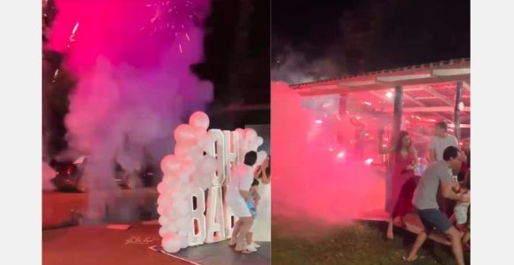 O vídeo foi compartilhado nas redes sociais pela mãe Paula Ravani, que descobriu que está esperando uma menina, Sophia. Imagens mostram o momento que o foguetório começa e assusta os convidados, que correm para se proteger.