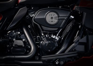 A Street Glide Ultra 2025 é equipada com motor Milwaukee-Oito 117 de válvulas suspensas operadas por haste de pressão com elevadores hidráulicos autoajustáveis, e quatro válvulas por cilindro. Gera potência de 105 cv a 4.600 rpm e torque de 176 Nm a 3.250 rpm.