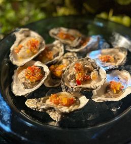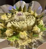 O destaque da noite foi a “Mesa Mar”, repleta de mexilhões, vôngoles, caviar, hadoque, salmão, atum e robalo. Estava um espetáculo o cannoli de gergelim recheado de tartare de atum, maionese de wasabi e gengibre. A saborosíssima caldeirada de mexilhões e vôngoles é um conforto quentinho após saborear terrines de salmão gravlax com ovas, de hadoque com aspargos e o ceviche de robalo com fitas de coco e manga.