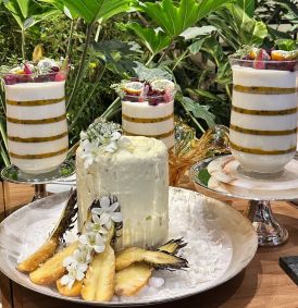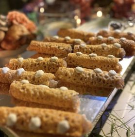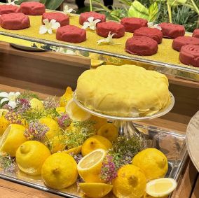 As sobremesas estavam uma perdição. Adorei os entremets de limão e de framboesa. Fiquei encantada pela leveza da panacota de maracujá com pitaia. Ainda havia cocada de forno, carrot cake (o bolo de cenoura na versão estadunidense), tiramisù (o clássico italiano), baclava (receita turca tradicionalmente elaborada com nozes), cookie gigante recheado com creme de avelã, merengata de frutas vermelhas e rogel cake, receita de torta argentina que intercala camadas de massa crocante com “dulce de leche”.