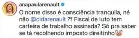 "O nome disso é consciência tranquila, né não, Cida? Fiscal de luto tem carteira de trabalho assinada? Só pra saber se tá recolhendo imposto diretinho", comentou a jornalista em uma publicação no Instagram.
