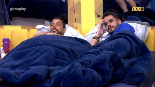 "É. Ela tá só...", disse Eva. João Pedro completou a fala da sister: "Segurando. Na hora que ela estourar, meu amigo! A Aline vai ficar..."