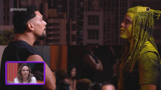 A confusão cessa quando Tadeu Schmidt interrompe a discussão e dá prosseguimento à dinâmica. "Quem é o próximo?", questiona o apresentador, e a dupla se cala.