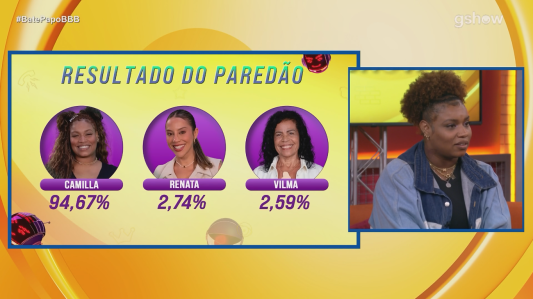 Camilla descobriu a porcentagem de votos que recebeu ao ser eliminada do BBB 25 na noite desta terça-feira (4). A trancista deixou o programa com 94,67% dos votos e, agora, ocupa o TOP 4 de maiores rejeições da história do BBB em Paredões triplos.
