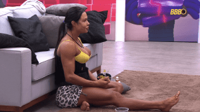 Gracyanne chegou ao local devorando salada, frutas, castanhas e refrigerantes. Sem academia, a musa fitness tem se exercitado em frente à TV, enquanto assiste diálogos da casa mais vigiada do país.