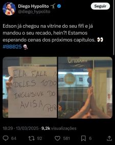 Com cartaz em mãos, Edson pediu para a bailarina alertar os irmãos sobre Gracyanne Barbosa, aliada deles no jogo. "Avisa eles sobre a Gracy. Ela fala mal deles todo dia! Inclusive do remédio. Avisa, por favor", escreveu o ex-atleta de ginástica de trampolim.