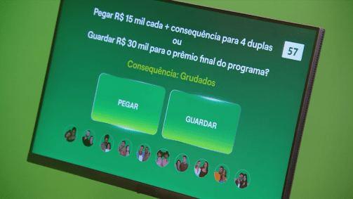 O dilema foi o seguinte: "Pegar R$ 15 mil cada + consequência para 4 duplas ou Guardar R$ 30 mil para o prêmio final do programa".