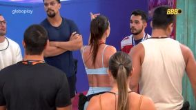 Guilherme tenta apaziguar a situação e uma roda se forma. "Ontem eu passei pra ir no banheiro e escutei ela falando de mim", garante João Pedro.