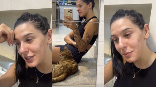 Em seguida, o gato se deita ao lado dela e ela comenta: "Nunca fica assim. Hoje ficou". O gato da artista é da raça Bengal, que tem como característica a pelagem semelhante a de um leopardo.