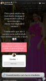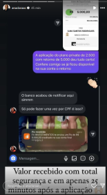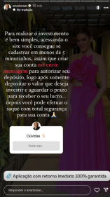 Nas publicações, os invasores divulgam links de um suposto investimento com lucros de até R$ 100 mil, mas tudo se trata de um golpe. Eles ainda usaram os stories para explicar como funciona a ação.
