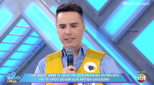 Luiz Bacci, de 40 anos, marcou presença no 'Domingo Legal', do SBT, neste domingo (9), quando participou do quadro 'Passa ou Repassa'. Durante o programa, apresentado por Celso Portiolli, de 57 anos, o jornalista se emocionou ao falar sobre sua saída da Record TV.