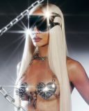 O traje conta com um biquíni de metal, além de correntes na cintura. A esposa do ator Nicolas Prattes ainda ainda optou por grandes óculos escuros, sandálias de salto alto e cabelos longos e loiros.