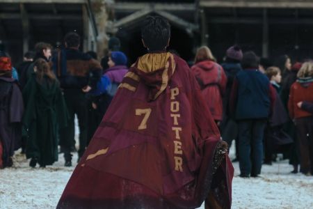 Com vestes vermelhas e amarelas, cores da Grifinória, uma das quatro casas da Escola de Magia e Bruxaria de Hogwarts, Potter aparece de costas em direção ao campo de Quadribol da instituição. O bruxinho veste o uniforme de número 7 do time e empunha a vassoura Nimbus 2000 em uma das mãos.