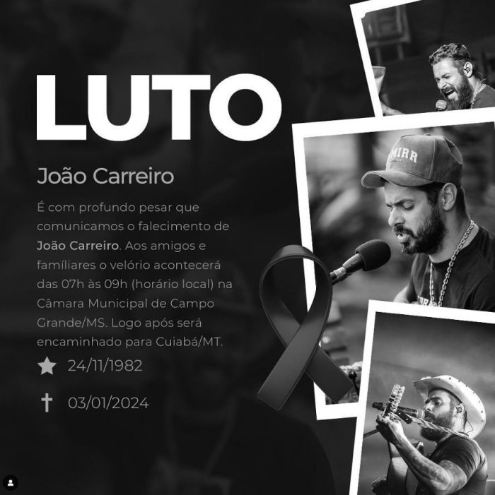 O corpo do cantor sertanejo João Carreiro, que morreu na noite dessa quarta-feira (3), está sendo velado na Câmara Municipal de Campo Grande, no Mato Grosso do Sul. No comunicado postado nas redes sociais do cantor, diz ainda que o velório acontece das 7h às 9h, em logo em seguida, o corpo será encaminhado para Cuiabá, onde será enterrado.