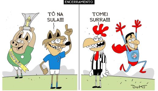 Chargista da Itatiaia, Duke ilustrou nesta quinta-feira (7) o encerramento das participações de Cruzeiro e Atlético no Campeonato Brasileiro. A Raposa empatou com o Palmeiras por 1 a 1, enquanto o Galo foi superado pelo Bahia por 4 a 1.