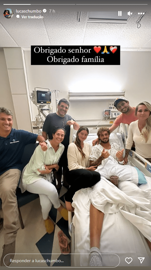 Pelos stories do Instagram, o surfista publicou a imagem com a legenda "Obrigado senhor, obrigado família". Chumbinho estava acordado no momento da foto. Quando sofreu o acidente, ele tentava fazer uma manobra, mas acabou se desequilibrando e caiu no meio da onda. Ele foi resgatado por colegas, desacordado.
