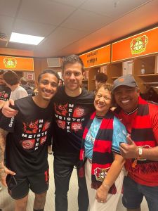 A família do lateral-direito Arthur, ex-América, estava presente na BayArena para assistir à partida que confirmou a conquista do Leverkusen e registrou o momento de festa da torcida dos “leões”.