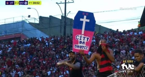 Na mão direita do rapaz, estava um "caixão" com as cores do Bahia com os seguintes dizeres "City da Shopee", em clara referência ao investimento feito pelo Grupo City no Bahia.