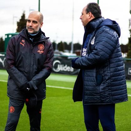 Técnicos Rogério Ceni e Pep Guardiola conversaram durante os treinos no CT do Manchester City