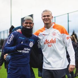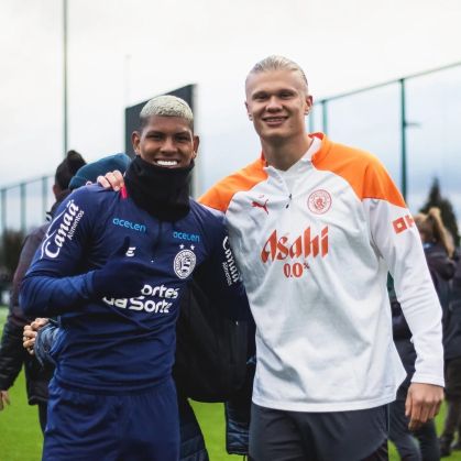Um dos astros da equipe inglesa, o atacante norueguês Haaland também aparece nas imagens ao lado dos zagueiros Marcos Victor.