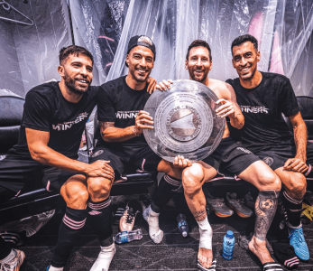Para celebrar a taça da primeira posição na temporada regular da Liga Norte-Americana (MLS), o craque escreveu “Vamo Inter”, em alusão ao nome de seu time, Inter Miami.