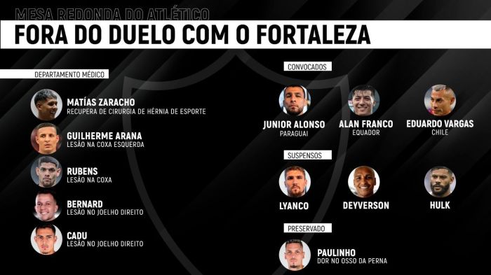- Rubens - com lesão na coxa, o "cria" está descartado para os três próximos confrontos do Atlético na temporada (Fortaleza, Vasco e River).