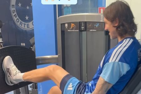No vídeo, é possível ver o arqueiro fazendo exercícios de musculação com a perna esquerda na Toca da Raposa II, em Belo Horizonte.