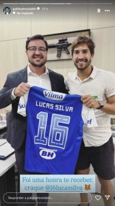 "Hoje tive a honra de receber o Lucas Silva em meu gabinete! Obrigado pela visita, irmão. Deus te abençoe, craque!!", escreveu Pablo Almeida, ao compartilhar vídeo da visita de Lucas Silva na Câmara Municipal de Belo Horizonte.