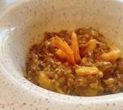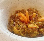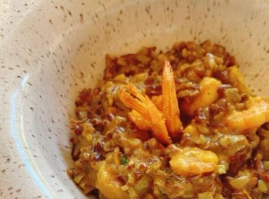 Risoto de arroz vermelho com camarão, leite de coco e pimenta-de-cheiro