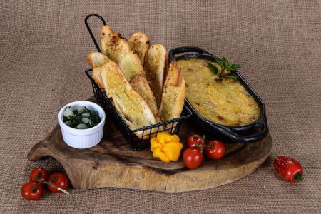 Prato: Corapan - Pão baguete, creme de alho, corações de frango assados, vinagrete picante coberto com uma mistura de parmesão e muçarela, gratinado ao forno. Acompanha molho de pimenta de lá.