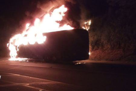 Ônibus pega fogo após colisão com motocicleta na Zona da Mata